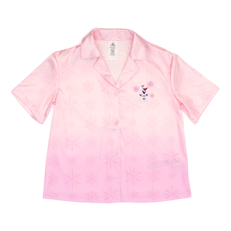 Whatever the weather, this satin jacquard Olaf sleep set is luxurious and fun any time of year. Everyone’s favorite snowman is screen printed on the button-down shirt. The allover snowflake print adds to its brrr-illiance. Inspired by Disney’s Frozen, these pretty pink pajamas look as great as they feel.