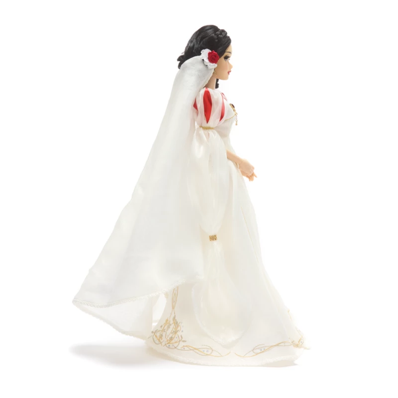 ”Magic mirror on the wall, who is the fairest one of all?” In honor of the 85th Anniversary of Snow White and the Seven Dwarfs, this collectible doll imagines the enchanting bride as her happily-ever-after dreams come true. A classic beauty with ”lips red as the rose, hair black as ebony, skin white as snow,” celebrate Walt Disney’s original Princess with this storybook wedding keepsake.