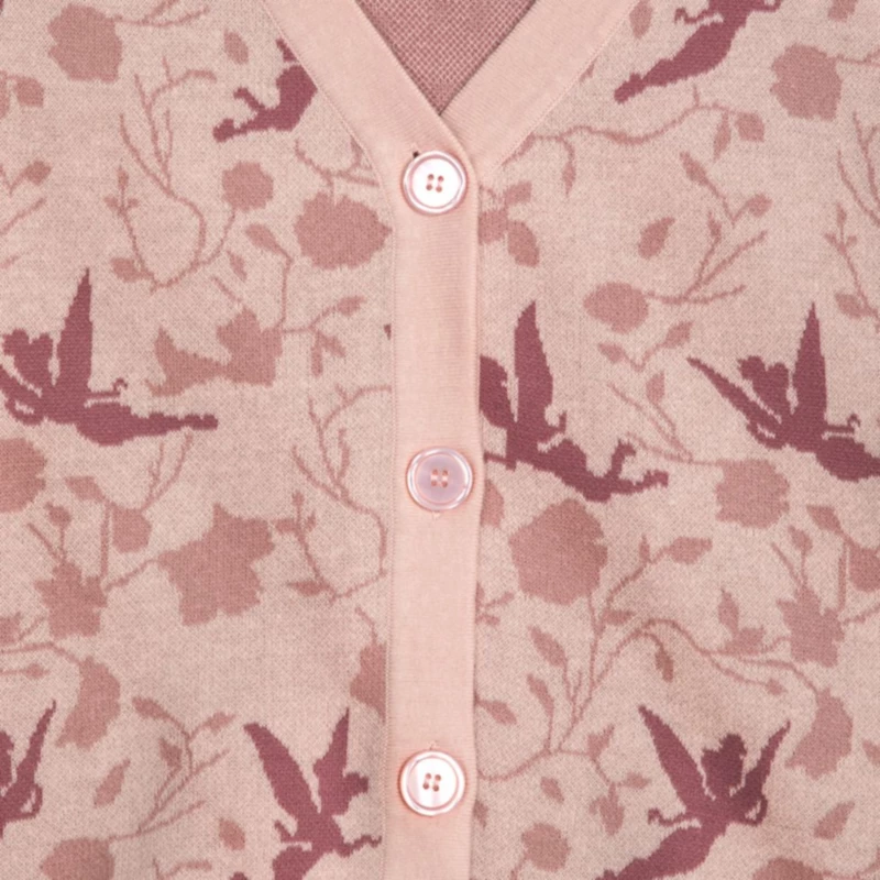 Imagine yourself in Never Land as Tinker Bell soars all around this cardigan. The allover intarsia knit pattern features the little fairy from Disney’s Peter Pan intertwined with a floral design and is complemented by three large pink buttons.